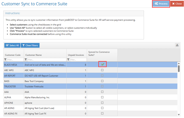 Select Commerce Suite Customer Sync. A grid populated with active customers opens.